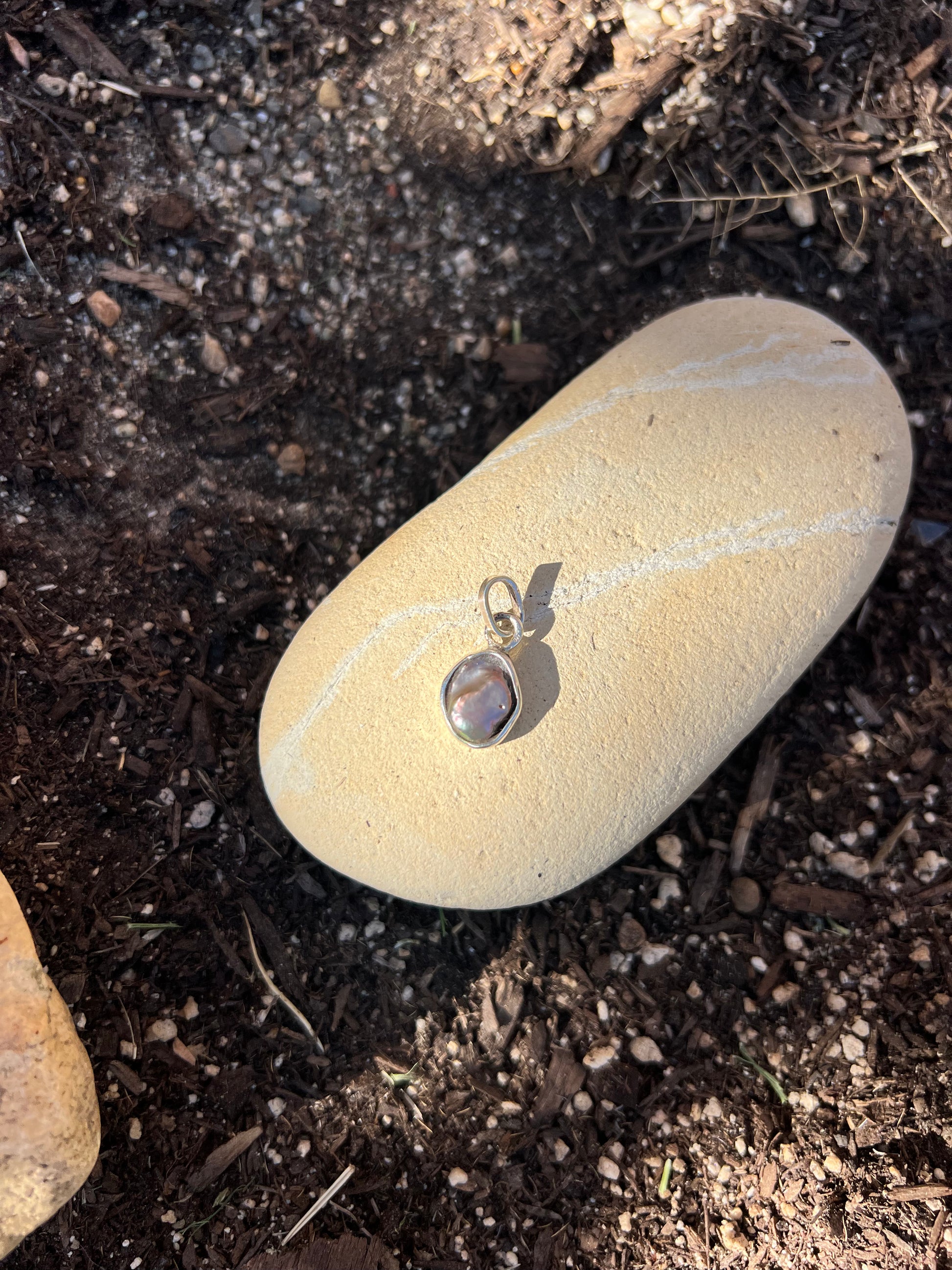 Iridescent round baroque pearl pendant set in sterling silver. This pearl is unique, showing natural variations in color and pattern. This particular pearl has more of a purple shade.