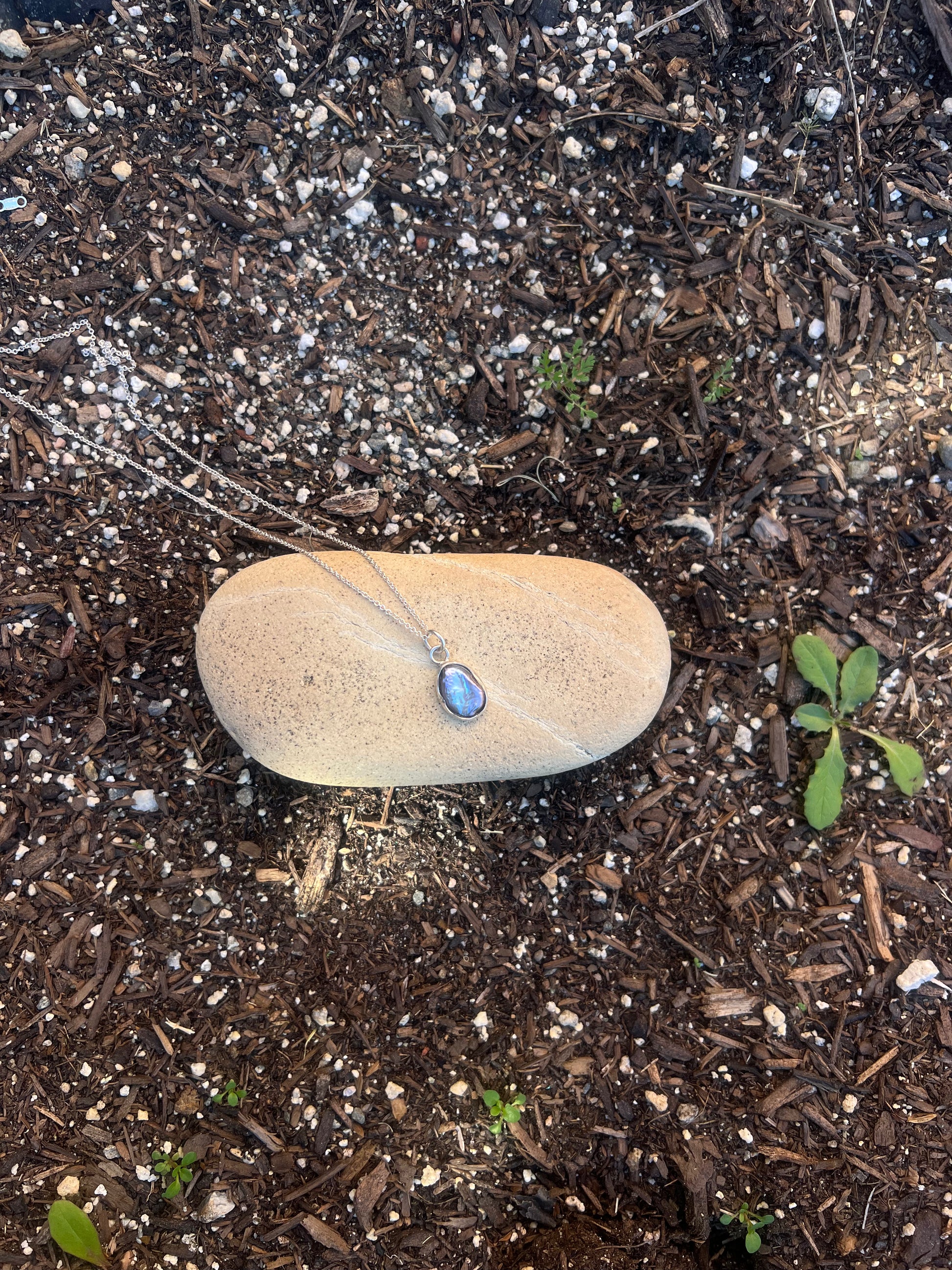 Iridescent purple baroque pearl set in 925 sterling silver. This pearl is one-of-a-kind with natural variations in color and pattern, featuring a subtle purple iridescence that catches the light beautifully.