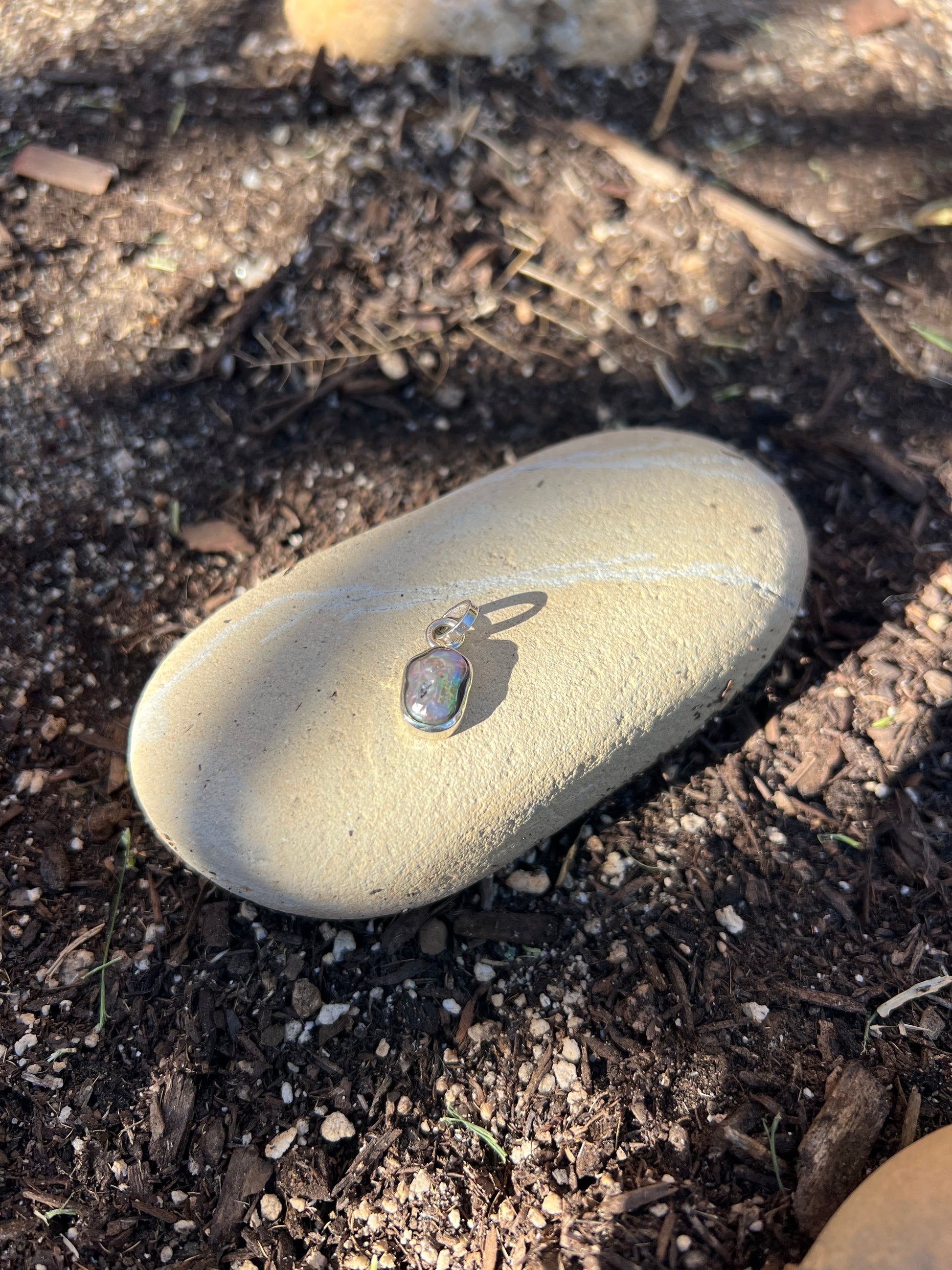 Iridescent square baroque pearl pendant set in sterling silver. This pearl is unique, showing natural variations in color and pattern. This pearl has a purple and green iridescence.